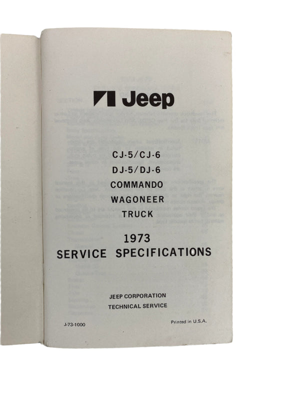 Used OEM Original Service Specifications Manual for 1973 AMC Jeep Corporation Jeep CJ-5/CJ-6, DJ-5/DJ-6, Commando, Wagoneer, Truck. Good condition overall with some normal wear.